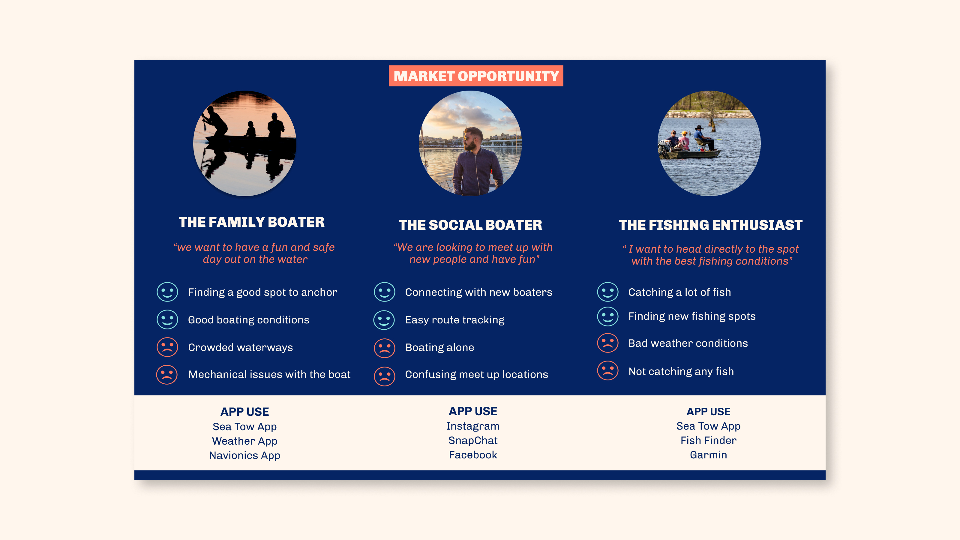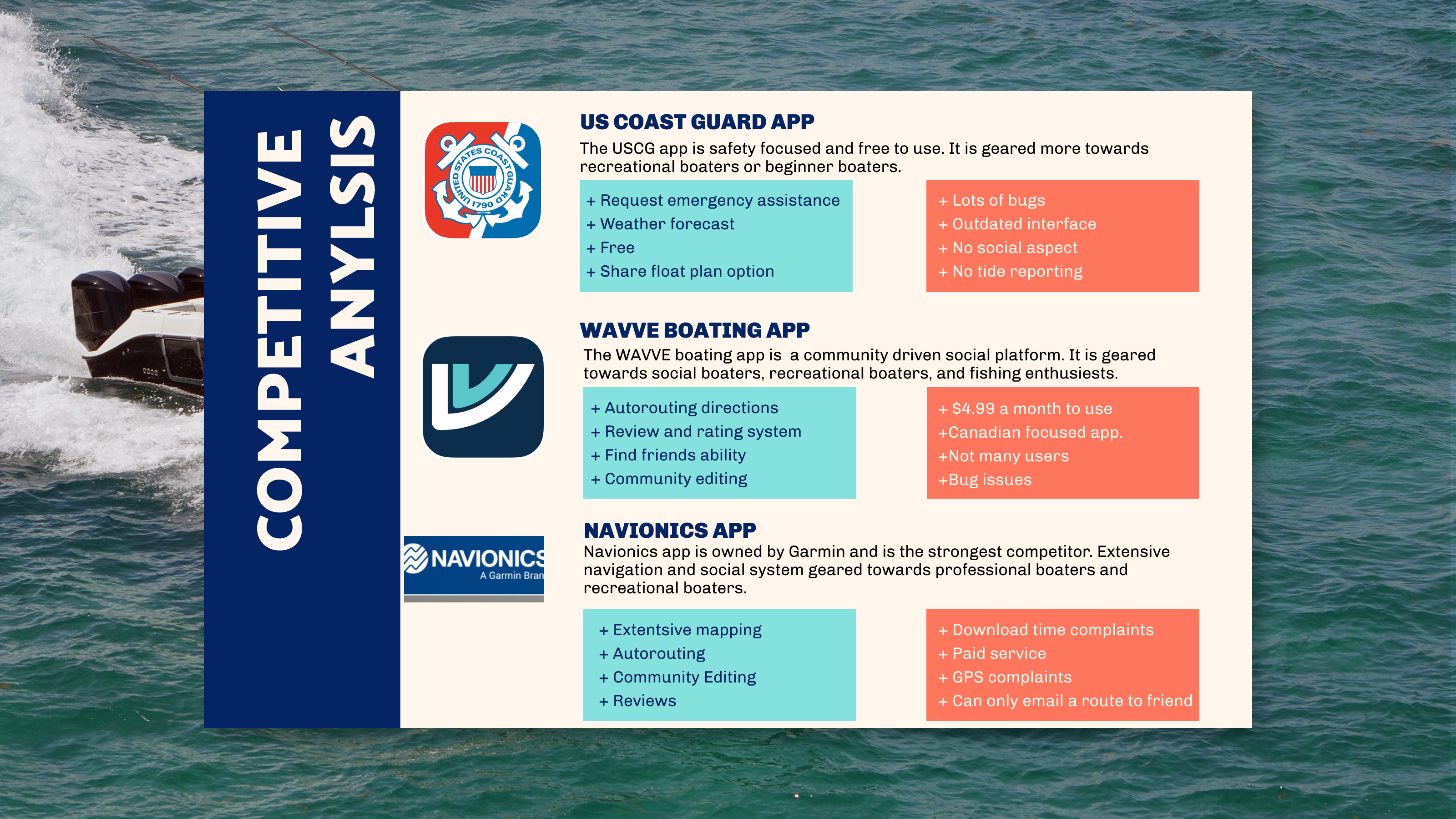To begin defining my primary user group and better understand their boating motivations, I conducted 3 user interviews, a contextual inquiry of a group of ten boaters, and a competitive analysis of other available applications. From my research, I found three main user viewpoints: Users that boat to spend time with their family, Users that boat to socialize, and Users that are sportsmen (fishing, crabbing, hunting) I looked into where these users currently sourced their boating information. Top responses from respondents were: Garmin GPS for navigation, Word of mouth, and Various weather and tide apps. I found social boaters most likely to connect with other boaters and meet up in different locations. The majority of these users utilize their cell phone to connect with people through use of messaging platforms on Instagram or SnapChat, but also used word of mouth to visit new areas. A main pain point for these users was boating alone and not knowing where to go to meet up with fellow boaters. A pleasure point for this user group was having a fun and new social experience out on the water. "I met friends out at a water concert. It was a unique boat centric experience. I liked the social aspect of it." Many boaters I spoke to reported that it is hard to find events or meetups on the water. They tend to be random experiences or not well announced to the boating community.